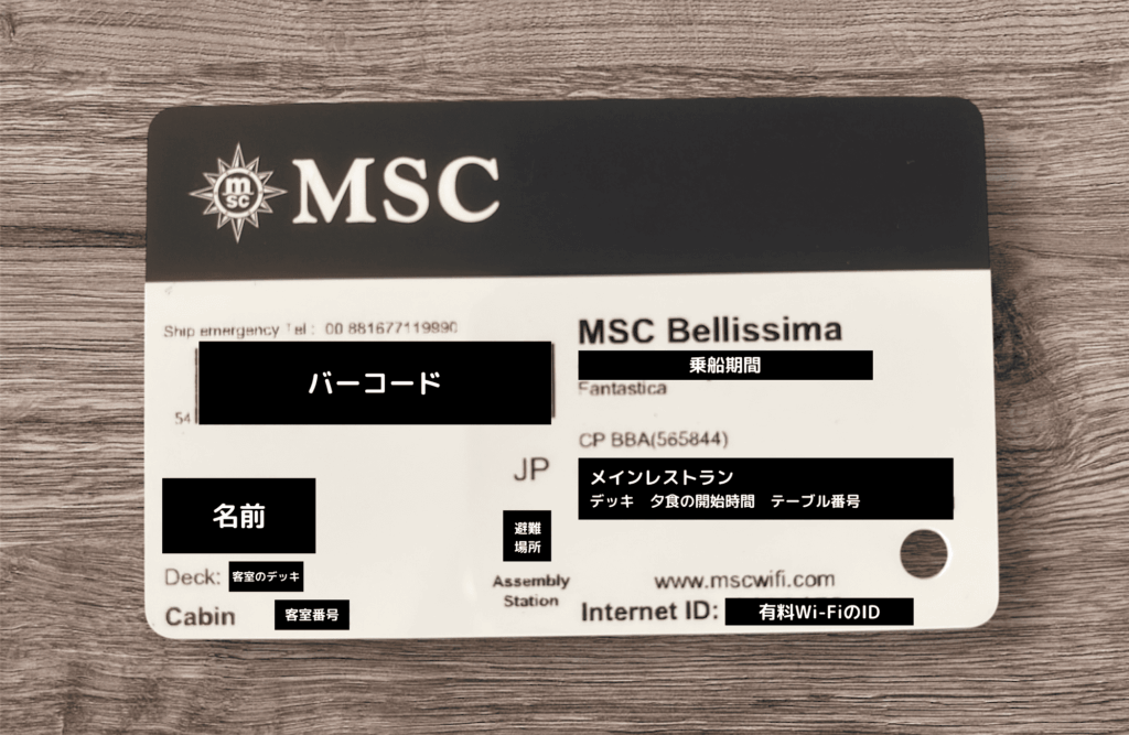 このカードは客室のルームキー兼身分証明書となっていますが、船内での支払い時にも使用します。